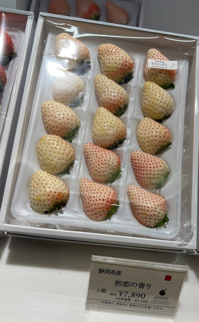 Are you planning your dream Tokyo vacation and searching for that perfect blend of luxury shopping and gourmet dining? The breathtaking food hall in Ginza’s prestigious Mitsukoshi Department Store is an essential destination that seasoned travelers rave about! Below are special white strawberries ($52 for 15).
